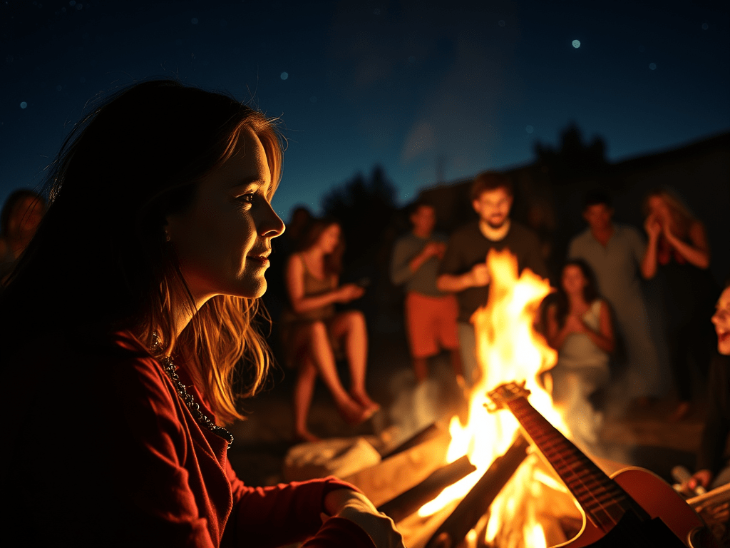 Shivanshi went to a retreat today. After the art therapy , during the night all the people sat around the bon fire . They all were spending leisure time – someone singing , some dancing ,